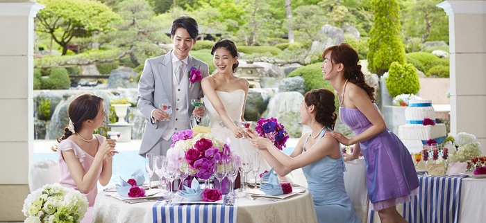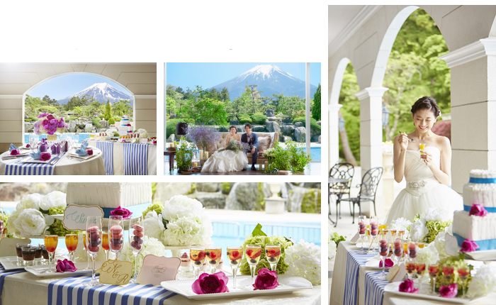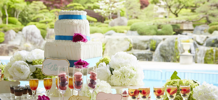 庭入場/テラス(ケーキ入刀・打ち上げ花火・デザートビュッフェ ・バルーンリリース)/プール(ドロップバルーン) [ 全会場共通 ] キャンドルサービス/アクアサービス/ドライアイスサービス/ビールサーブ